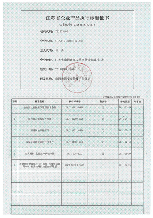 江蘇省企業(yè)產(chǎn)品執(zhí)行標(biāo)準(zhǔn)證書(shū)