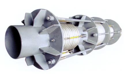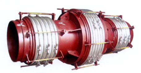 腰鼓式直管壓力平衡波紋膨脹節(jié)的兩端各有一個(gè)工作波紋管,中間有一個(gè)平衡波紋管,膨脹節(jié)通過受力構(gòu)件(大拉桿或舌管)來承受內(nèi)壓推力。因此管系只需中間固定支架。此類膨脹節(jié)只能吸收軸向位移。